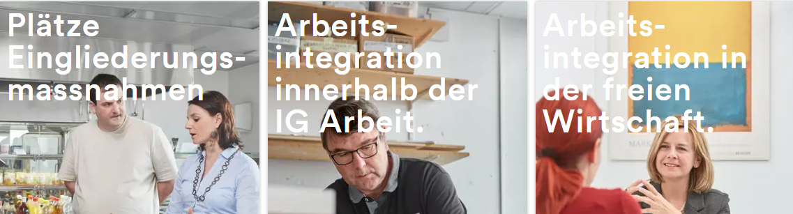 Die IG Arbeit verfügt über ein breites Angebot an Arbeits- und Ausbildungsplätzen, Beratungs- und Bildungsdienstleistungen für Menschen mit einer Leistungsbeeinträchtigung aus psychischen Gründen, die IV-Leistungen oder Sozialhilfe beziehen und / oder längere Zeit ohne Arbeit sind. Zusätzlich werden auch berufliche Eingliederungsmassnahmen der Invalidenversicherung durchgeführt.